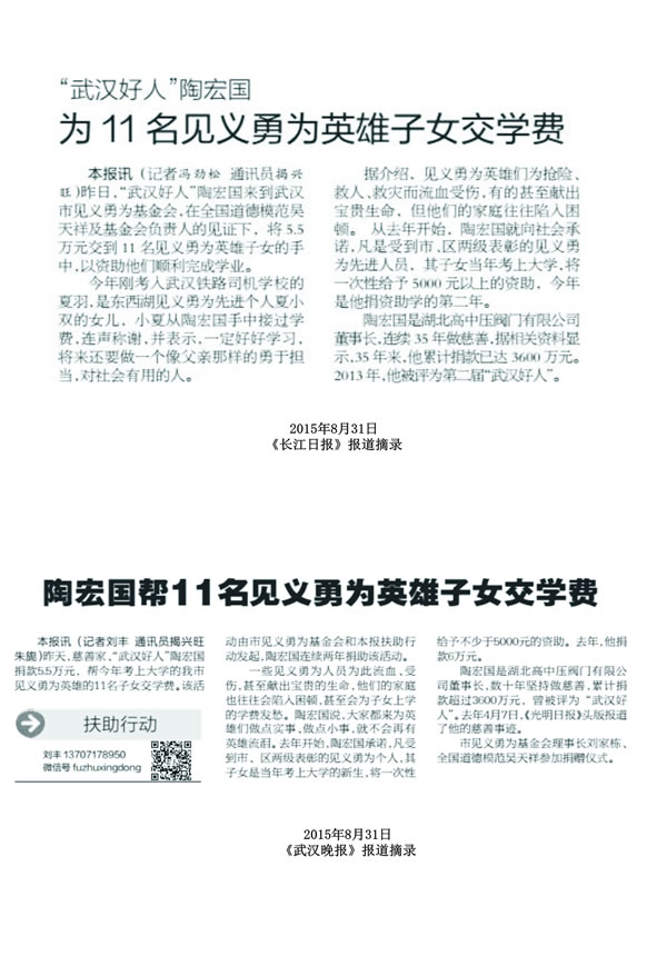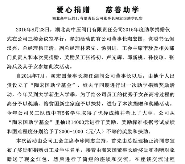 :湖北高中壓閥門有限責任公司董事長陶宏國助學紀實