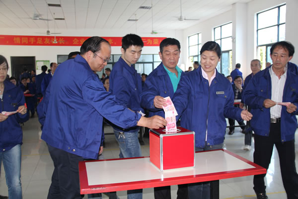 最后,董事長將公司總裝車間周志飛母親雙眼失明、妻子臥床不起加之他本人身帶殘疾的情況在會上進(jìn)行了通報(bào),號召全體員工獻(xiàn)愛心,自己帶頭捐款500元,公司副董事長程正紅、總經(jīng)理陶力、黨委書記但漢興、公司其他副總和工會主席也率先捐款,全體參會人員在他們的帶領(lǐng)下,都涌躍捐出200、100元或50、20元不等的現(xiàn)金,共計(jì)捐款額6790元。